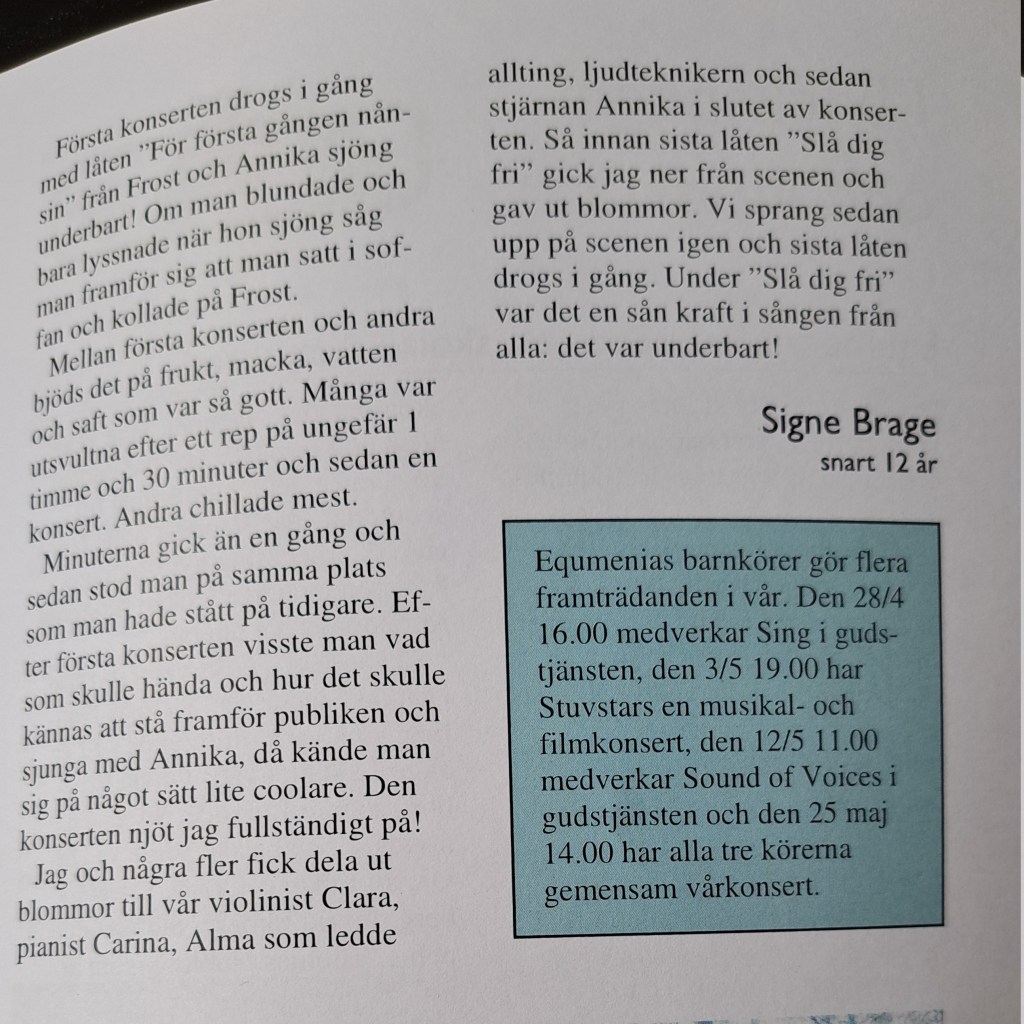 ”Det var alldeles fantastiskt att få jobba med Annika! Från första kontakt var samarbetet lätt och positivt. Hon var oerhört varm och uppmuntrande mot barnkörerna, och lyckades verkligen göra konserten till en vi-upplevelse med varenda ett av barnen. Dessutom inspirerade hon både körsångare och publik med sin fantastiska röst. Det är en av de absolut roligaste konserterna vi haft, och vi ser fram emot att jobba med Annika igen!”
